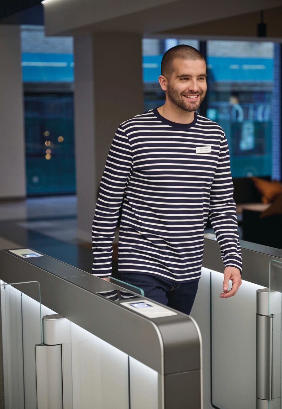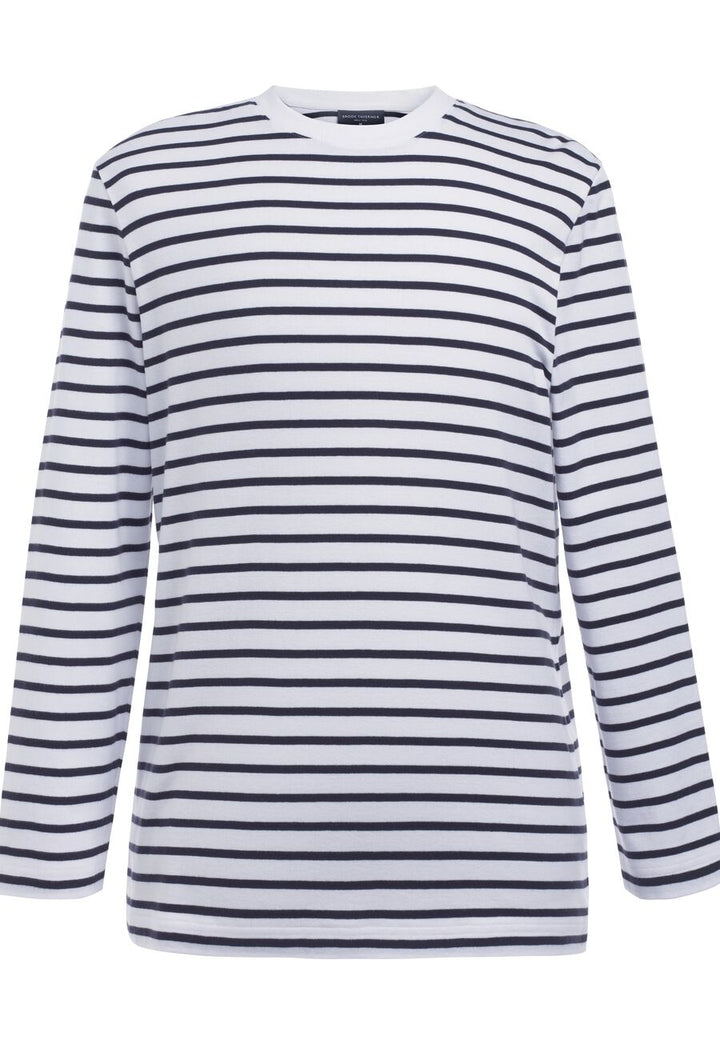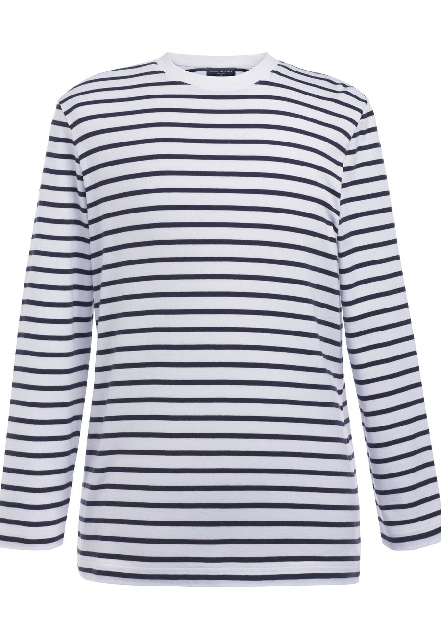 This top features a ribbed neckline, long sleeves, and twin needle stitching on the hem and cuff for durability and style.