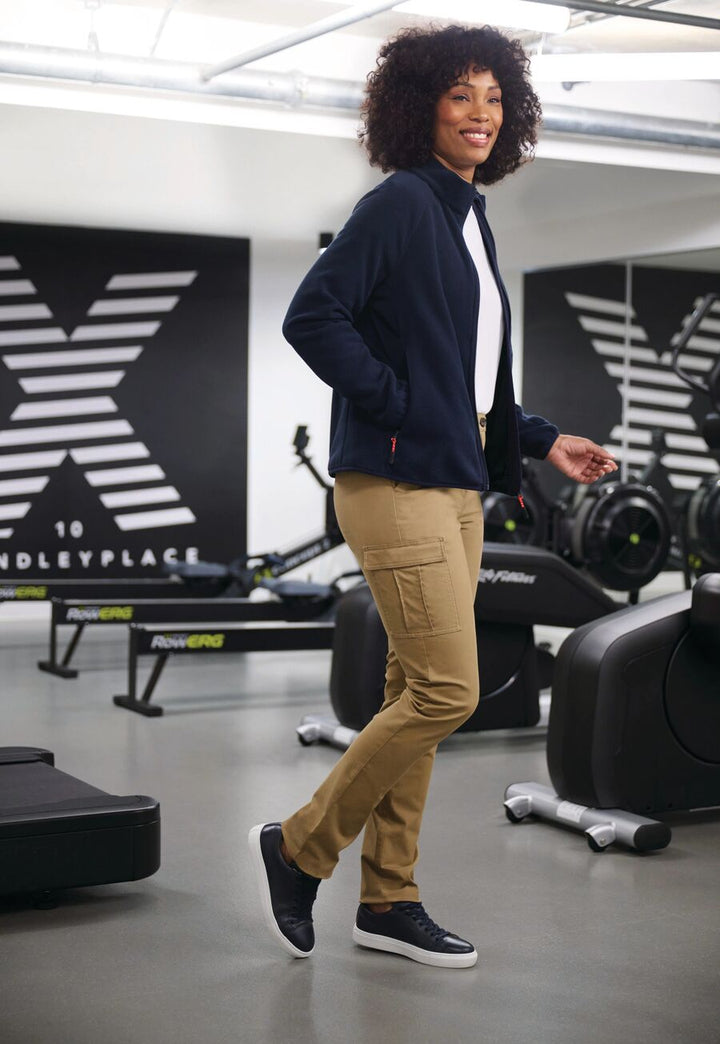 Expertly designed with a slim leg and functional features, the Carmel Ladies Cargo Chino boasts 2 cargo patch pockets, 2 side pockets, 2 rear jetted pockets, and belt loops with a button fastening.