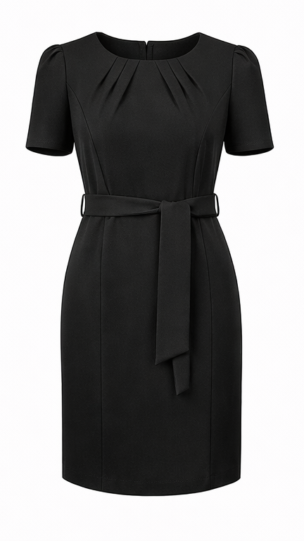 This Shift Dress offers a modern twist on a classic style with its fully lined design. The neckline features gentle pleats and shaped front panels, while the half sleeves are adorned with a tie belt.