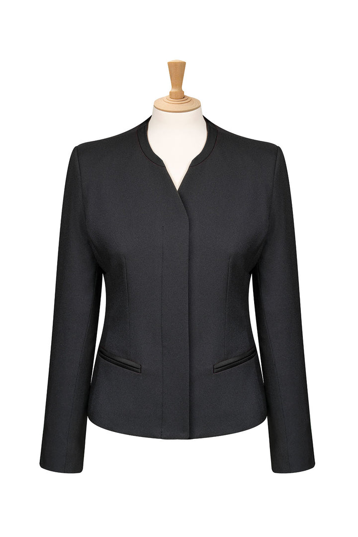 Professional experts agree that this medium length jacket, featuring a soft V shape neckline, concealed front buttons, and 2 jet pockets, is the epitome of chic couture.