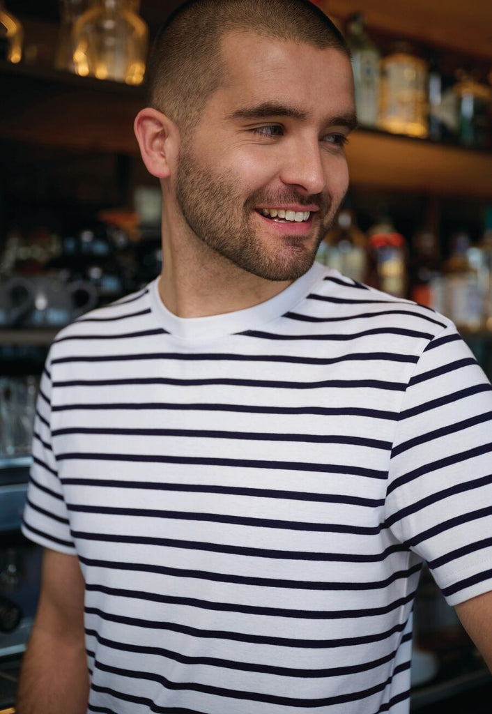 This top features a ribbed neckline, short sleeves, and twin needle stitching on the hem and cuff for durability and style.