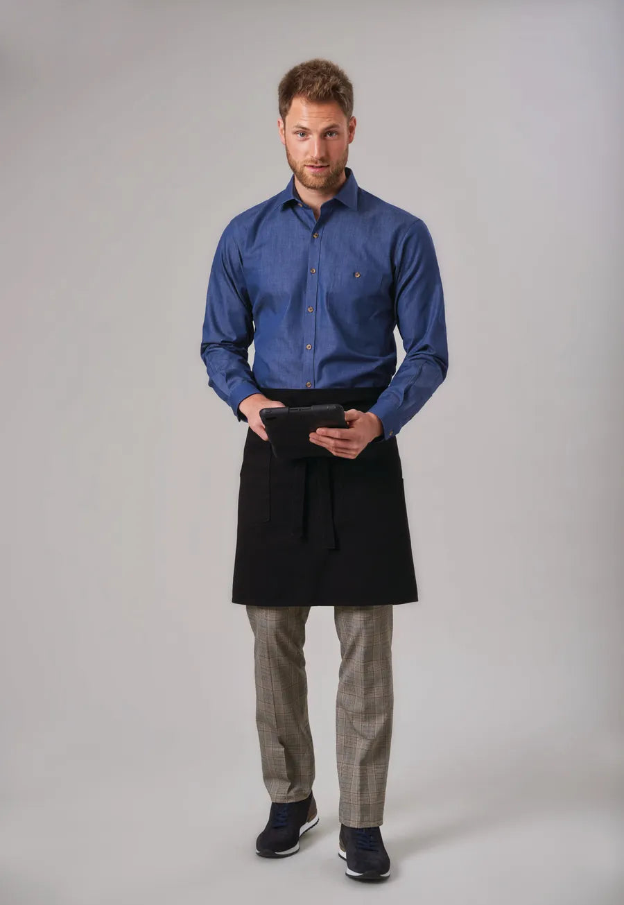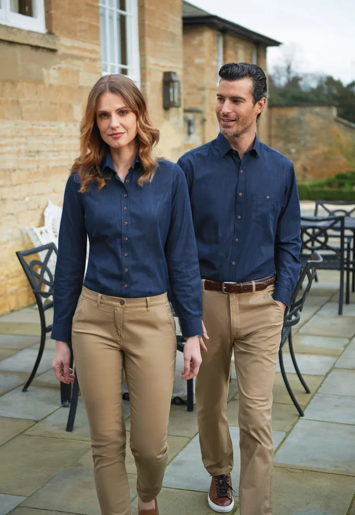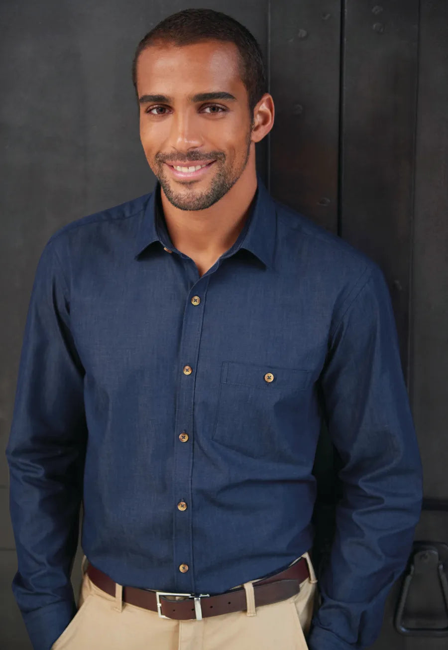 This men’s denim shirt combines rugged appeal with refined tailoring for a versatile, stylish look. Designed with a tailored fit for a sharp, streamlined silhouette, it features a chest pocket with a button for added functionality and style. The faux horn buttons add a touch of sophistication, while the contrast button detailing gives the shirt a distinctive, modern edge. Perfect for casual or smart-casual settings, this denim shirt delivers a blend of durability, comfort, and style, making it an essential piece for a contemporary uniform or everyday wear.