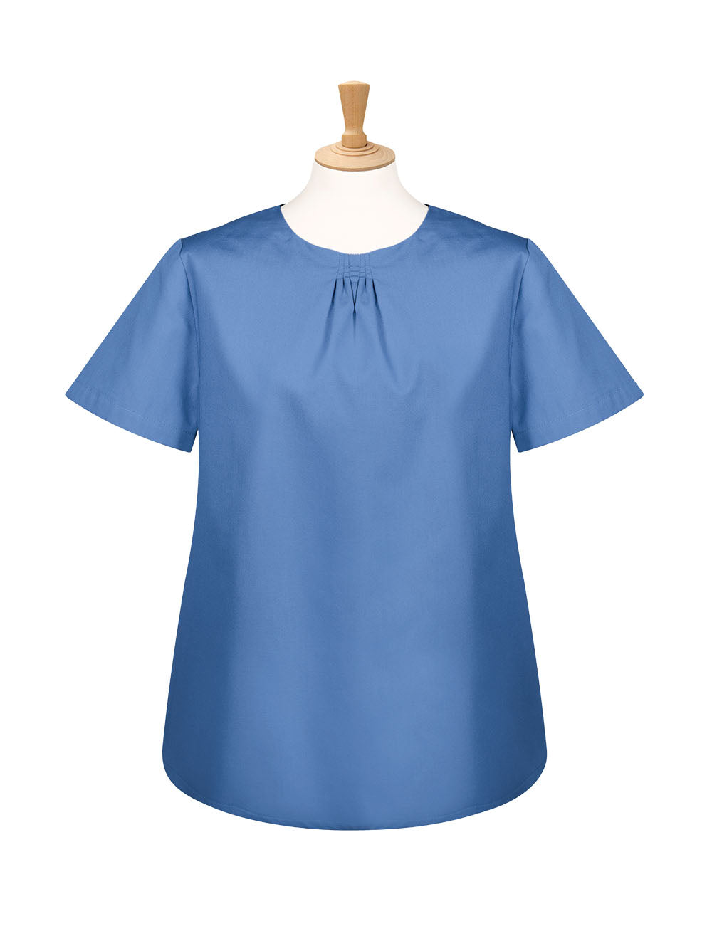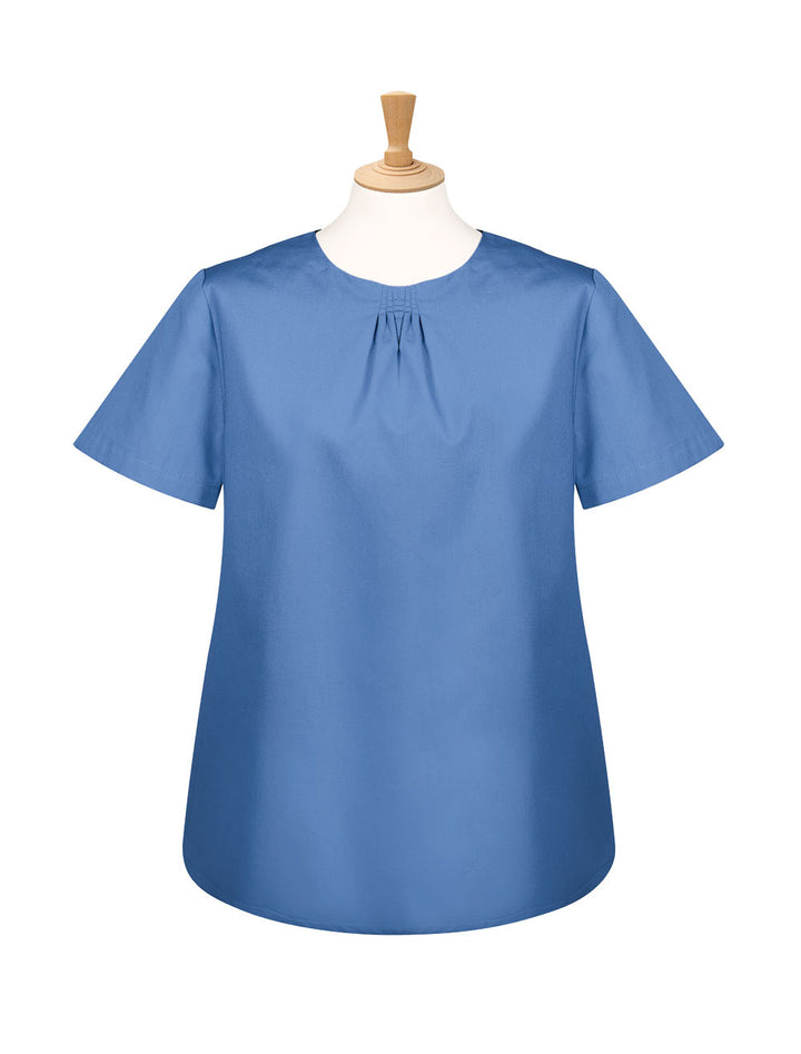 This blouse features a round neckline with delicate pleating and a single button closure at the back. The short sleeves have side vents for added comfort.