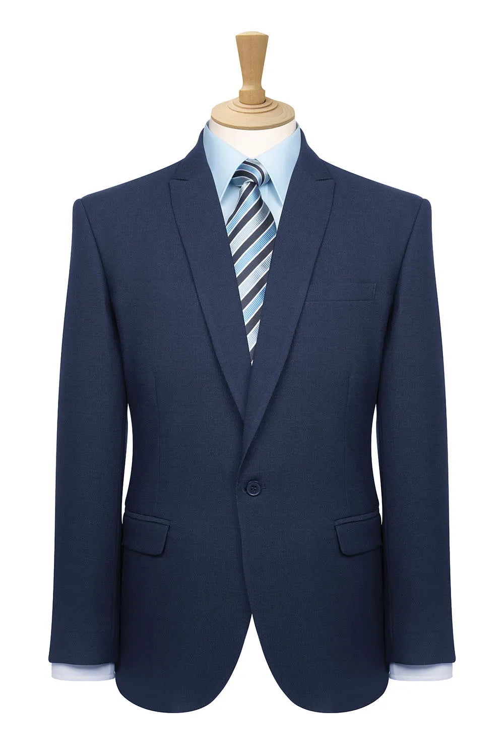 This slim fit jacket boasts a modern design, featuring a single button front and a back center vent. It also includes four convenient inside pockets.