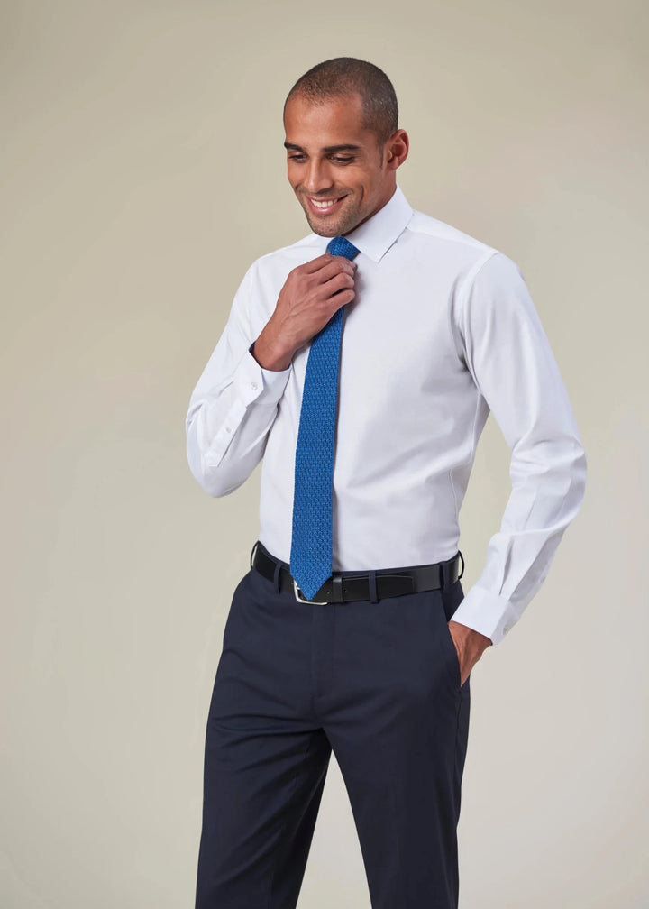 Slim fit, long sleeve, classic collar, contrast detailing, two rear darts.
