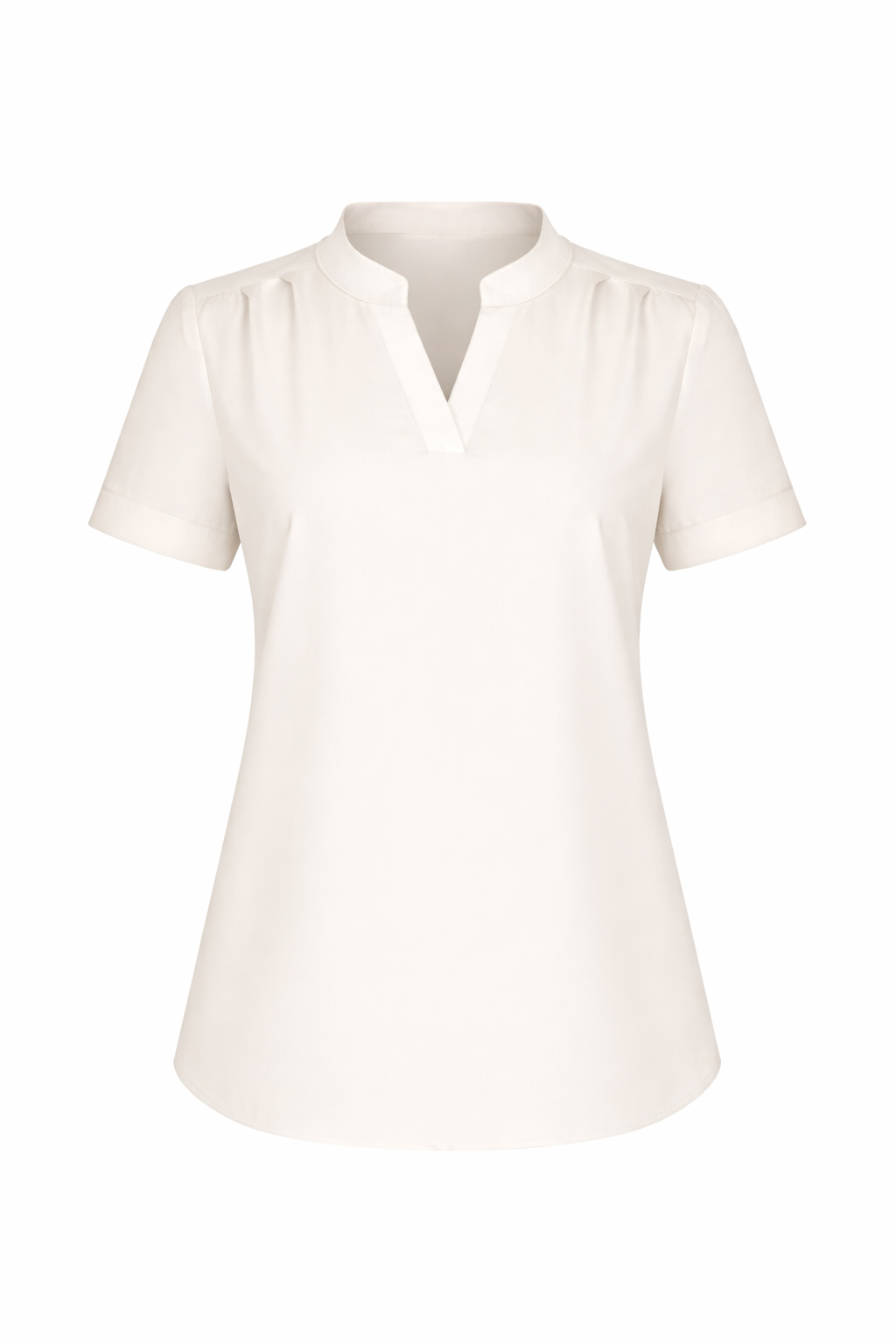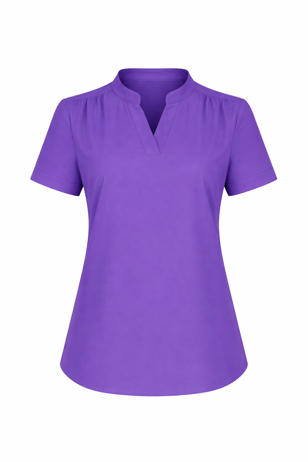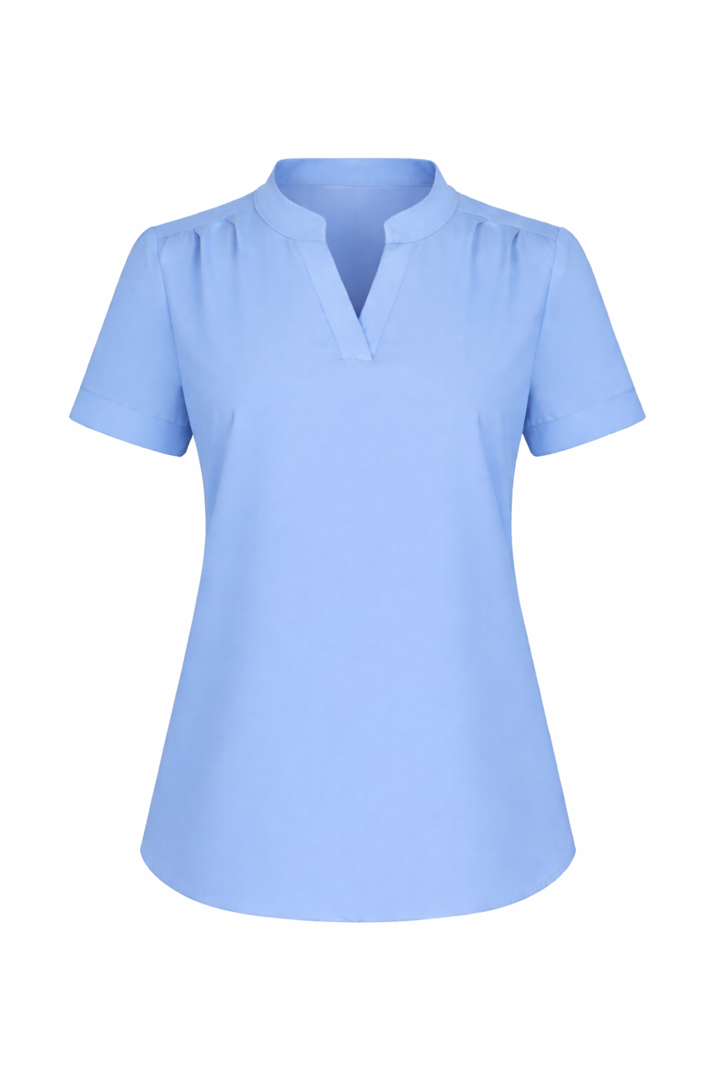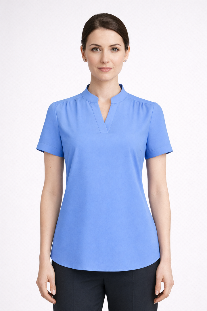 This blouse features a notch neck, soft shoulder pleats, and back yoke. With a pull on style and side vents, it offers sophisticated styling and a comfortable fit for any size. Available in short and long sleeve options.