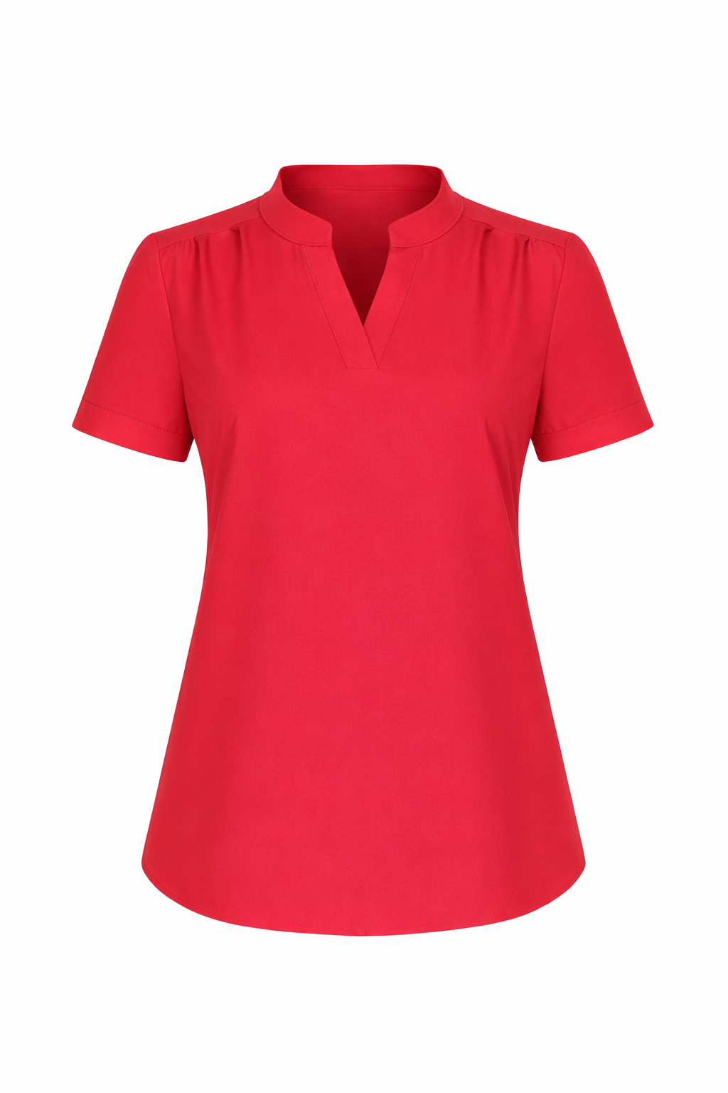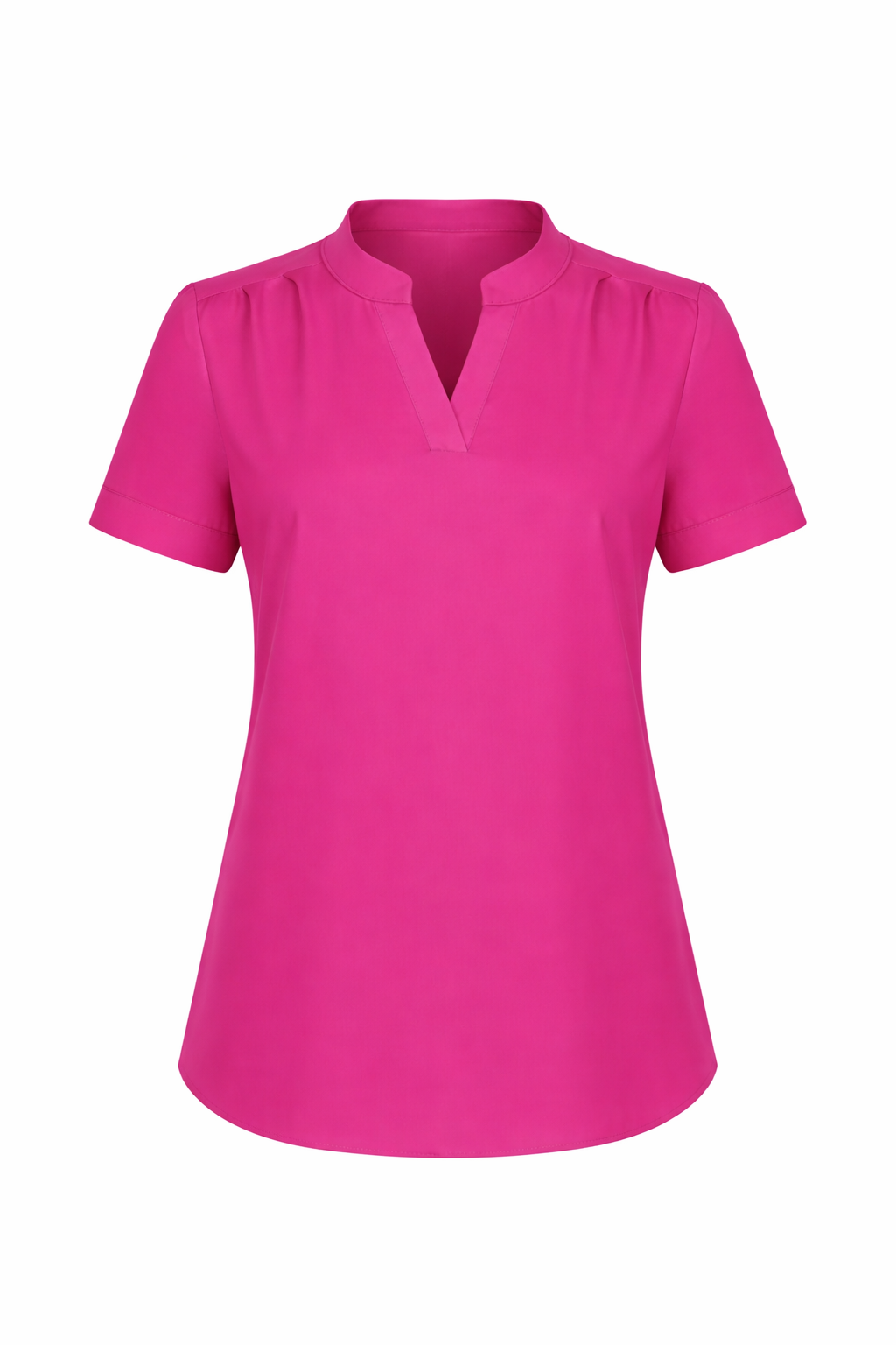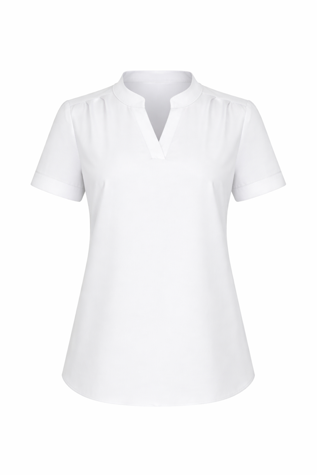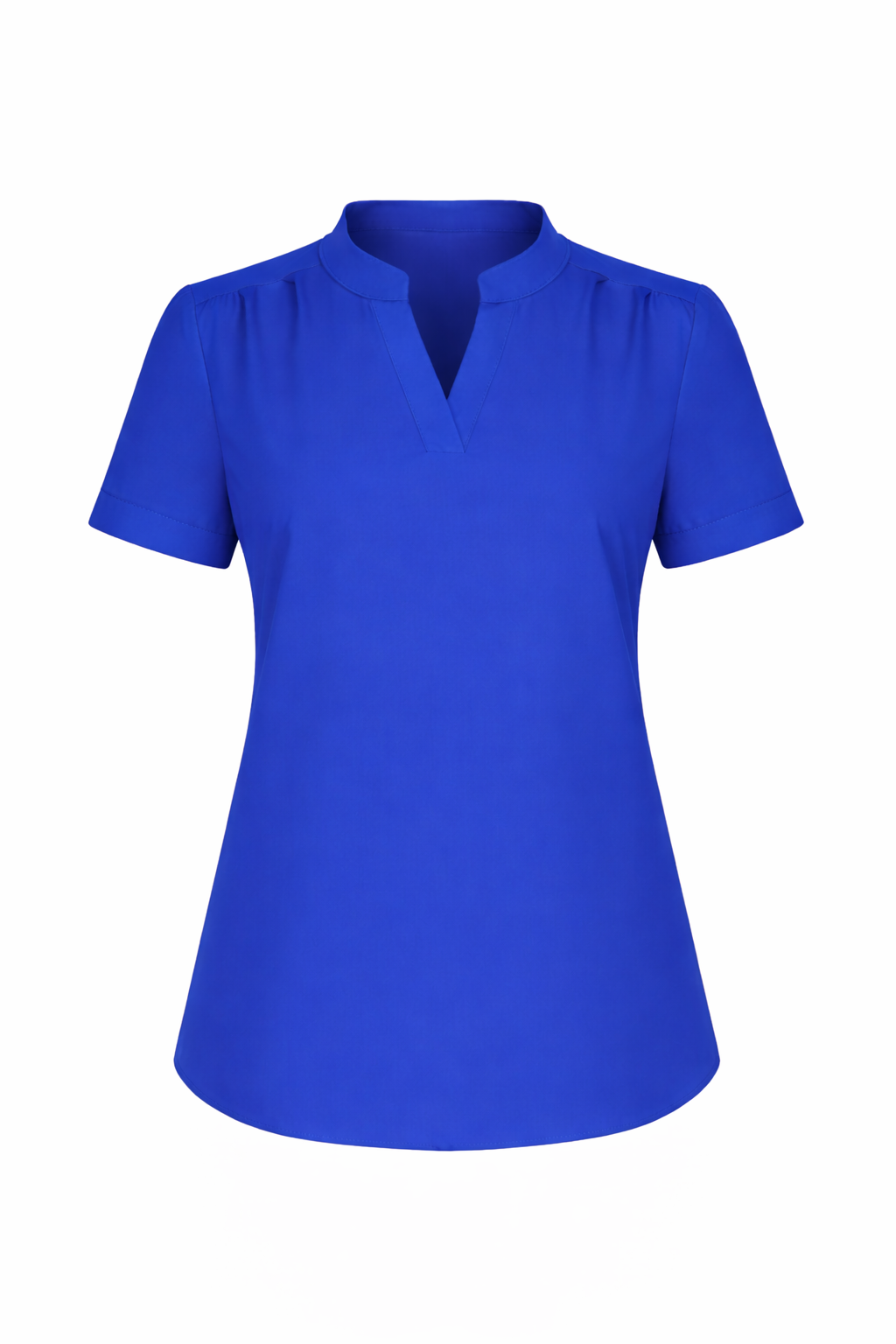 This blouse features a notch neck, soft shoulder pleats, and back yoke. With a pull on style and side vents, it offers sophisticated styling and a comfortable fit for any size. Available in short and long sleeve options.