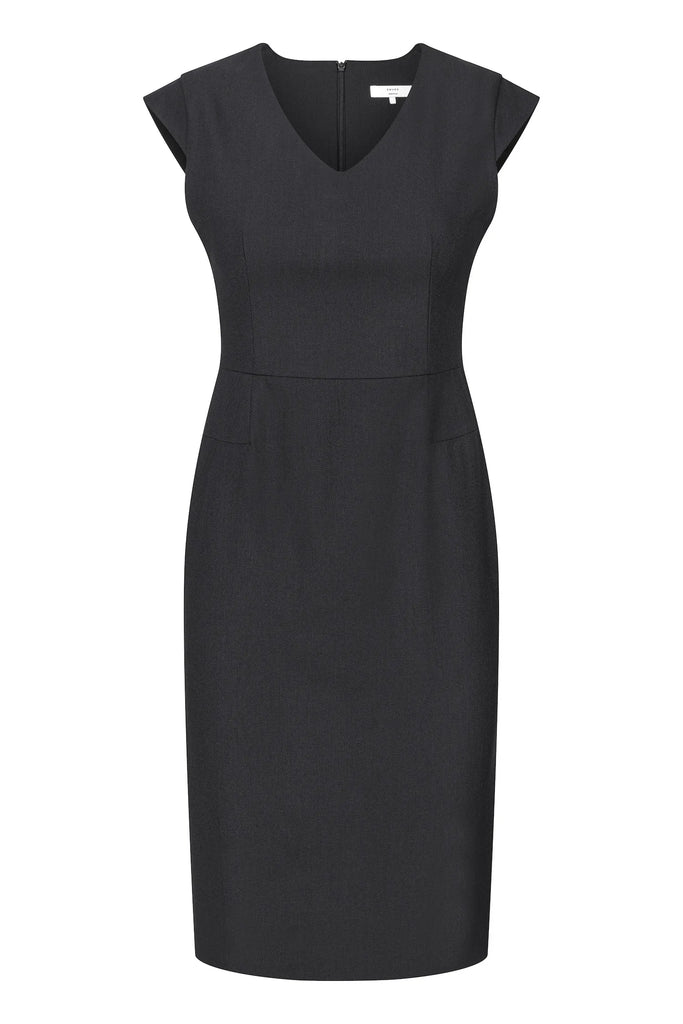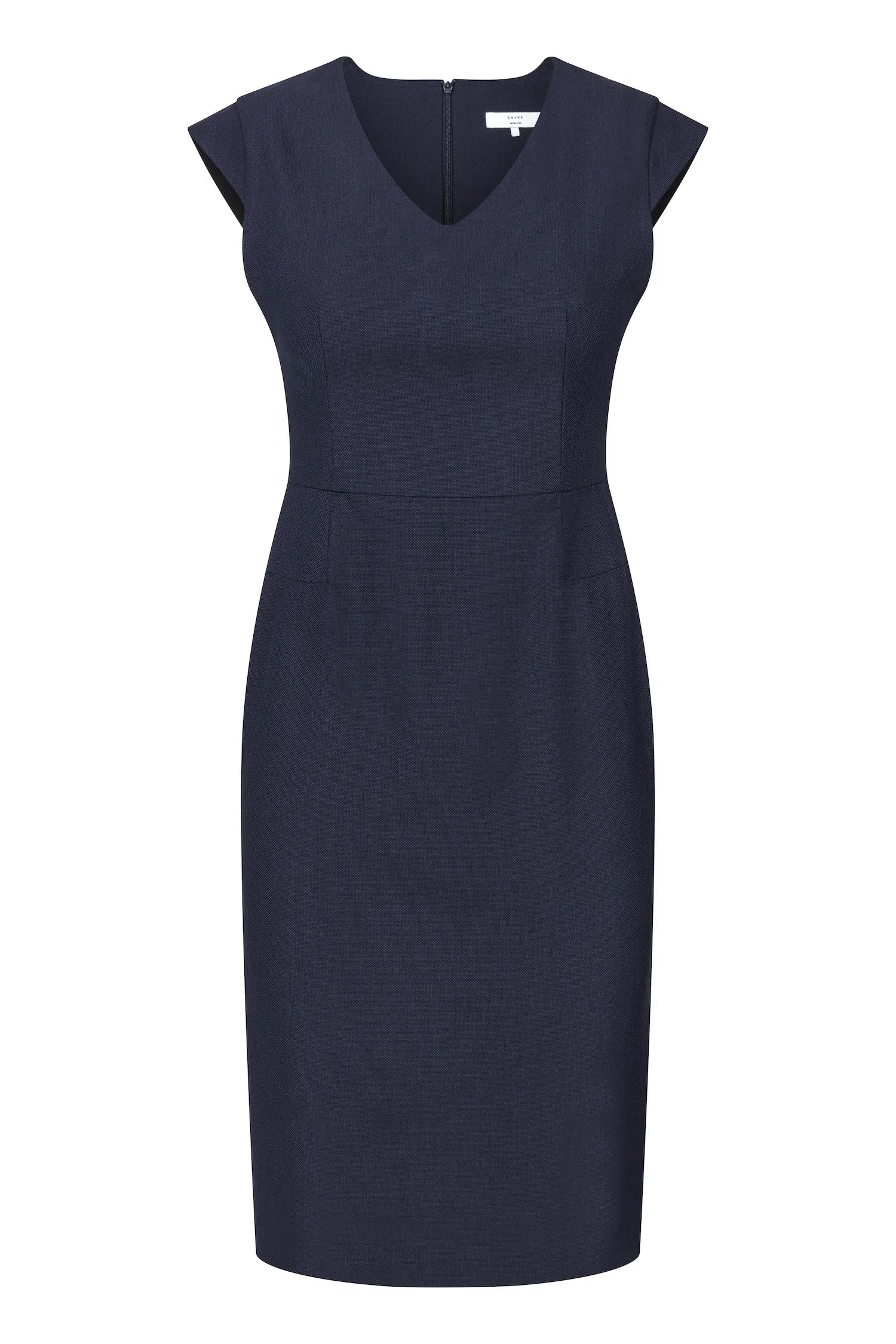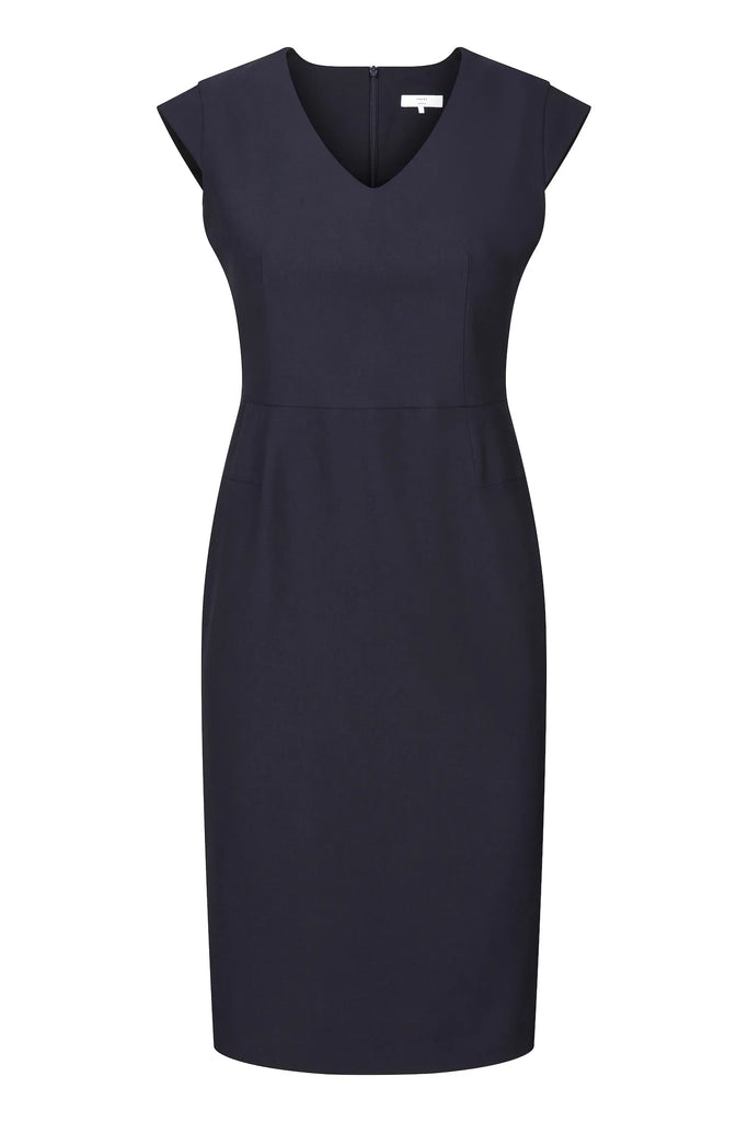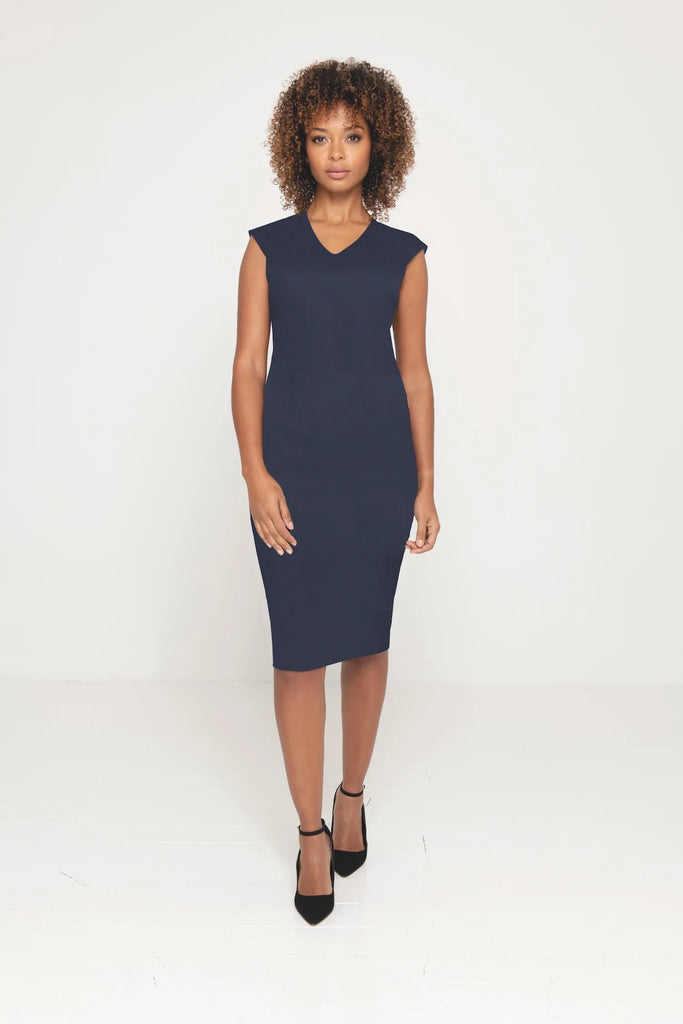 The Strozzi dress is designed to fall just below the knee. The v-neckline, capped sleeves offer a contemporary take on a classic workwear piece.